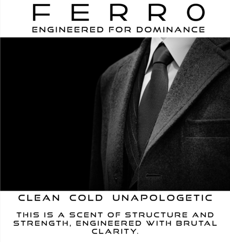 Ferro cuts through the air like precision-forged steel — sharp, clean, undeniable. This is a scent of structure and strength, engineered with brutal clarity. Cool metallic accords collide with bright citrus and crushed black pepper, settling into a dry core of vetiver and mineral musk. It’s modern, confident, and absolutely in control. There’s no softness here — only form, focus, and force.